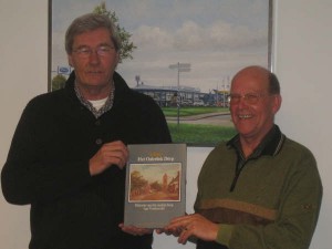 Scheidend voorzitter Meindert Rozema (rechts)overhandigde “Tolbert, Het Oalerliek Dörp”, het boek over de historie van Tolbert, aan de nieuwe voorzitter Wil Sikkens(links).